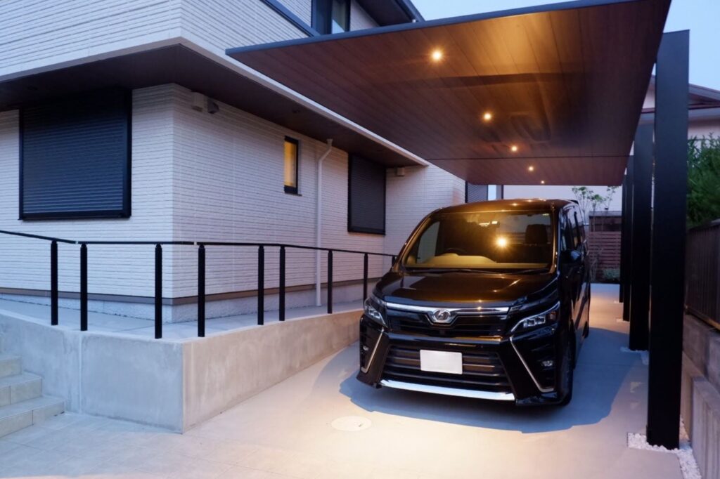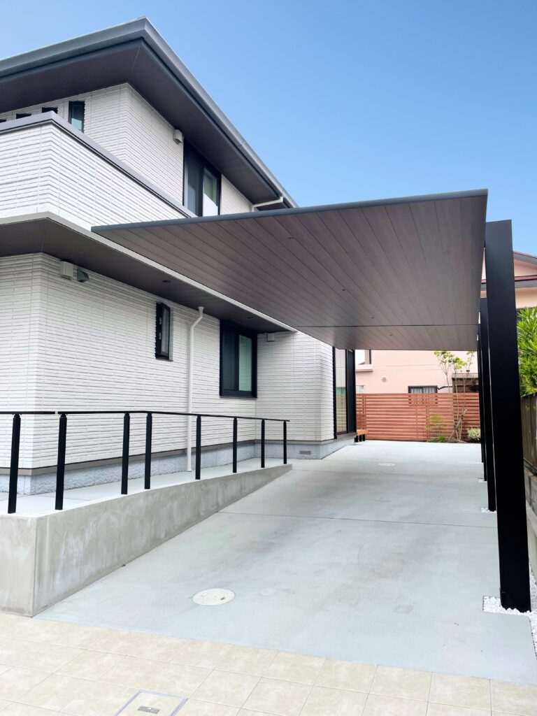 建物の軒とカーポート屋根の素材をリンクさせて一体感のある駐車場に。