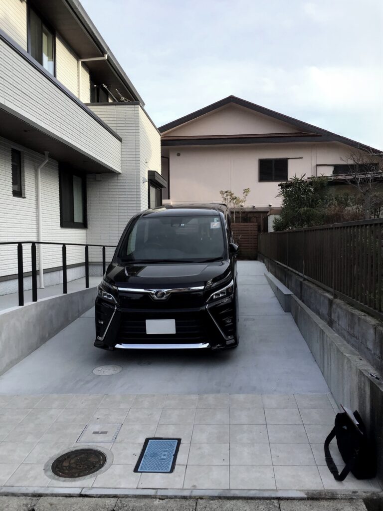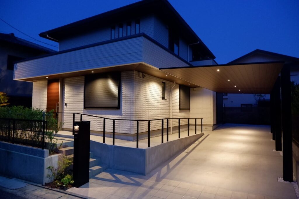 建物の軒とカーポート屋根の素材をリンクさせて一体感のある駐車場に。